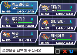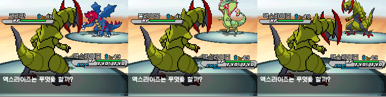 쌍용시티 체육관장 사간의 포켓몬(lv46 크리만, lv46 플라이곤, lv48 엑스라이즈)