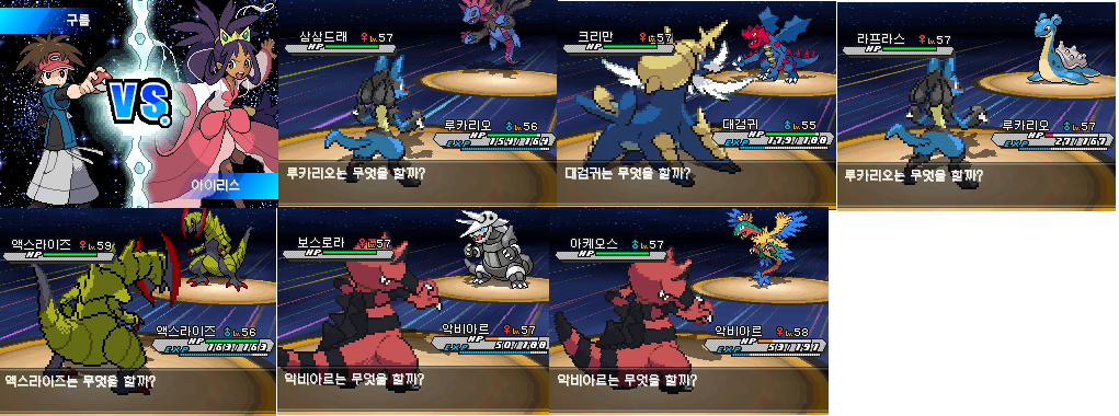 <챔피언 아이리스의 포켓몬 : lv57 삼삼드래, lv57 크리만, lv57 라프라스, lv57 보스로라, lv57 아케오스, lv59 액스라이즈>