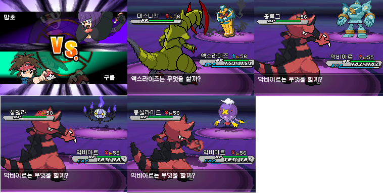 <망초의 포켓몬 : lv56 데스니칸, lv56 골루그, lv56 둥실라이드, lv58 샹델라>
