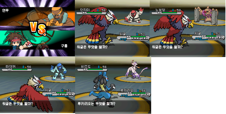 <연무의 포켓몬 : lv56 던지미, lv56 타격귀, lv56 비조도, lv58 노보청>