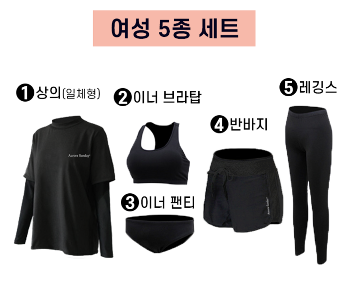 - 여성: 상의 래쉬가드 + 보드숏 + 레깅스 + 브라탑 + 이너팬츠