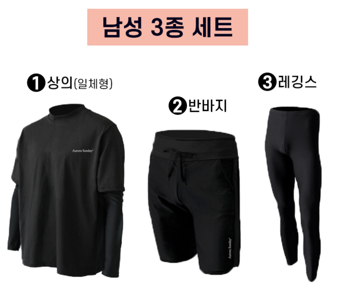 - 남성: 상의 래쉬가드 + 보드숏 + 레깅스
